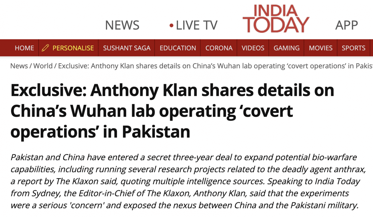 Theo India Today đưa tin, Anthony Klan, tổng biên tập, phóng viên điều tra người Úc của Tạp chí The Klaxon tiết lộ, thực ra nhà khoa học của Phòng Nghiên cứu Virus Vũ Hán đã hợp tác với Pakistan và các nhà khoa học của nước này từ lâu. Từ năm 2015 đến nay, đã tiến hành nghiên cứu về 5 loại mầm bệnh với các cấp độ khác nhau, sự việc này đã được cơ quan tình báo rất chú ý. Hiện tại Phòng Thí nghiệm Virus Vũ Hán và Tổ chức Kỹ thuật Khoa học Quốc phòng Pakistan (DESTO) đã ký kết một thỏa thuận bí mật, cùng nhau bắt tay tiến hành các dự án nghiên cứu bệnh truyền nhiễm mới nổi và kiểm soát bệnh tật lây lan.